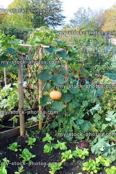 View Full                    Large Pumpkins In Allotment Vegetable Garden Hanging Down