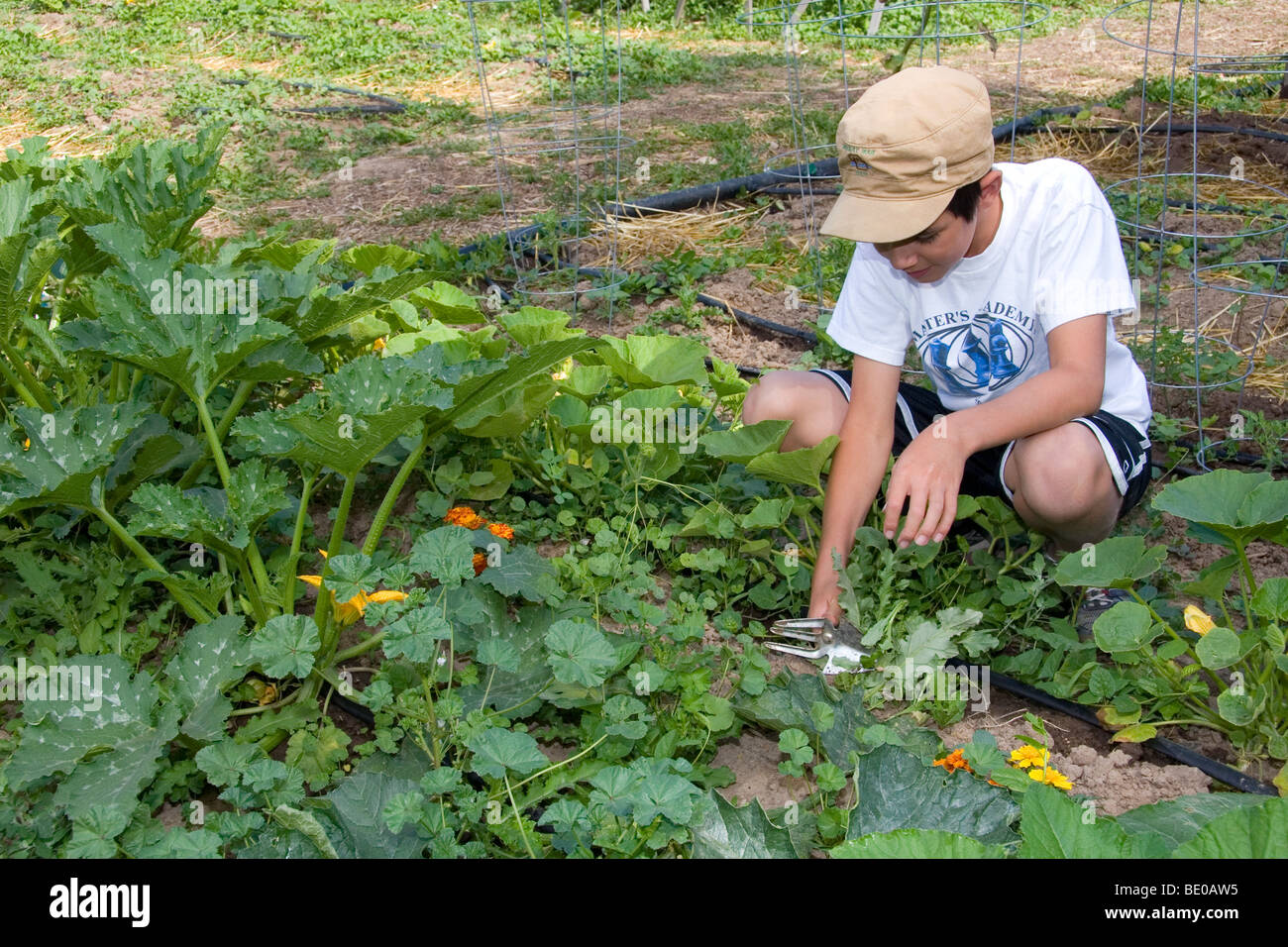 Young Boy Pulling Weeds In A Residential Vegetable Garden In Boise