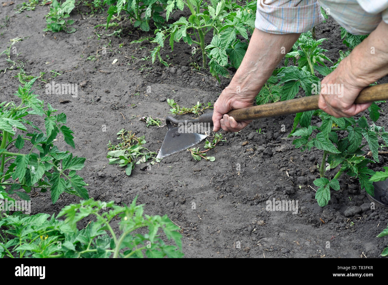 View FullGardener Pull Up Weeds With A Hoe In The Tomato Plantation In The