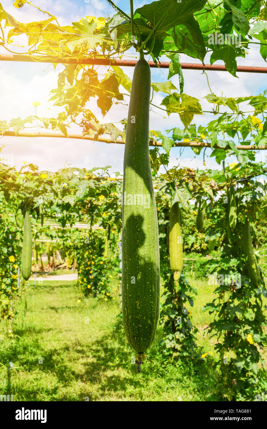 View FullGreen Sponge Gourd Hanging On Vine Growing In The Vegetable Garden